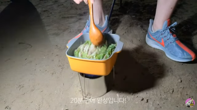 저희는 밀푀유 나베를 준비해왔는데요 전날 냉동실에 그대로 얼려서 냄비째로 들고와 자연해동시키고, 텀블러에 끓는 물을 담아와서 요리 시간을 단축시켰더니 20분만에 요리가 다 되었어요. 물은 절대 많이 하지 않고 재료가 80% 잠길 정도만 부었답니다. 역시 뚜껑 필수입니다. 나중에 이 육수에 라면도 끓였는데 30분이 넘어가는 시점이였고, 이때부터는 물이 끓긴 했지만 팍팍 끓는다기 보다는 보온효과정도의 불세기였어요. 그래서 너구리가 맛이 없었단..ㅠ