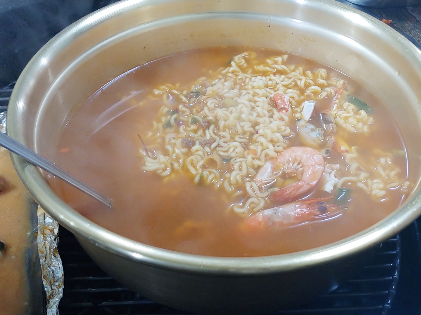 나중에 추가한 가리비와 해물라면입니다. 가리비는 추가 금액이 20,000원인데, 단품 구성이 더 좋아보인다는 느낌이네요. 아까도 말했지만 이정도 양이면 마진을 50% 더 붙이셔서 파는 것 같은데, 사실 장사하는 입장을 생각한다면 그렇게 값을 비싸게 받으시는 건 아니다는 생각이 슬금 들어요. 해물라면 5,000원은 2개를 시켰는데요 새우 몇개와 게 일부를 넣고 끓여주십니다. 넓은 양푼에 끓여다 주시는게 아주 맘에 들고요. 배만 덜 불렀어도 밥을 말아서 라면죽을 해먹었을 건데 조개를 괜히 더 추가했나 싶은 생각이 듭니다 ^^;
