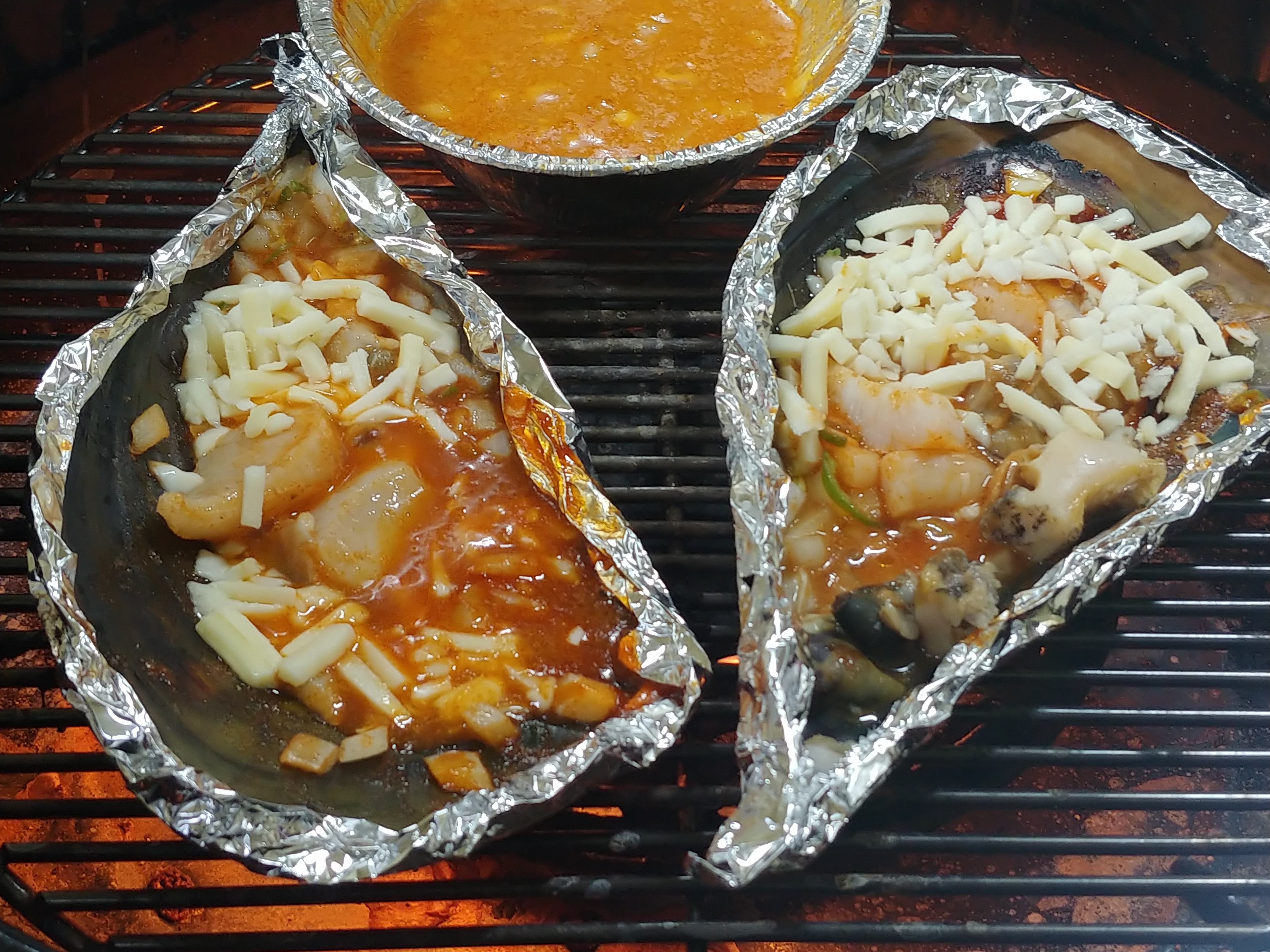키조개도 토마토소스와 초장, 그리고 양파 다진것과 치즈를 함께 얹어서 치즈가 녹으면 떠먹으면 됩니다. 자연스럽게 조개 물이 생기고 국물이 자작해지는데, 조갯살과 국물을 함께 뜨면 그렇게 시원하고 맛있을 수가 없어요. 홍가리비나 가리비 살이 살짝 익고 나서 조개에서 자연스럽게 살이 떨어지면 여기에 일부러 담궈서 더 익히기도 하고 양념을 입혀 먹기도 하죠. 4.9만원 세트에는 전복 2마리도 들어가 있습니다. 요새 양식을 하면서 전복이 흔해지긴 했지만, 그래도 이렇게 마주치면 반가운게 사실입니다 :))