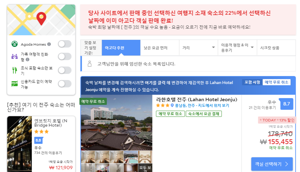 아고다 전주 라한 호텔 예약 가격 비교 공식 홈페이지보다 저렴한 15만원 선이지만 이 정부보조금 지원사업에 의해 예약한 가격이 여전히 훨씬 저렴합니다. 이 혜택, 안누리면 안되겠죠?
