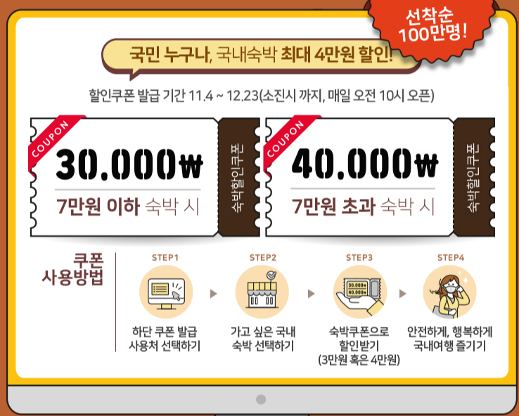 최대 할인 금액은? 7만원 이하 숙박시 3만 원의 할인 혜택이 주어지고, 7만원 초과 숙박시 4만원의 지원금을 받을 수 있습니다. 할인 쿠폰은 11. 4. ~ 12. 23. 까지 발급되는데요, 소진시까지 라는 말을 들으면 가슴이 불타오르는건 저 뿐만이 아니죠? 국가적인 차원에서 진행하는 '소진시까지' 행사는 무조건 참여하고 봐야합니다. 혜택이 꽤 클 뿐더러 생각보다 금방 동이나버리거든요. 지역화폐 이벤트로 50만원을 충전하면 10%를 환급, 즉 5만원을 웃돈으로 얹어주던 혜택이 3개월까지 기회가 있었는데, 마지막 달에 신청하려고 하니 기한은 다 되지 않았지만 준비했던 예산이 다 떨어져 더이상 그 이벤트는 종료되었다고 하더라고요.