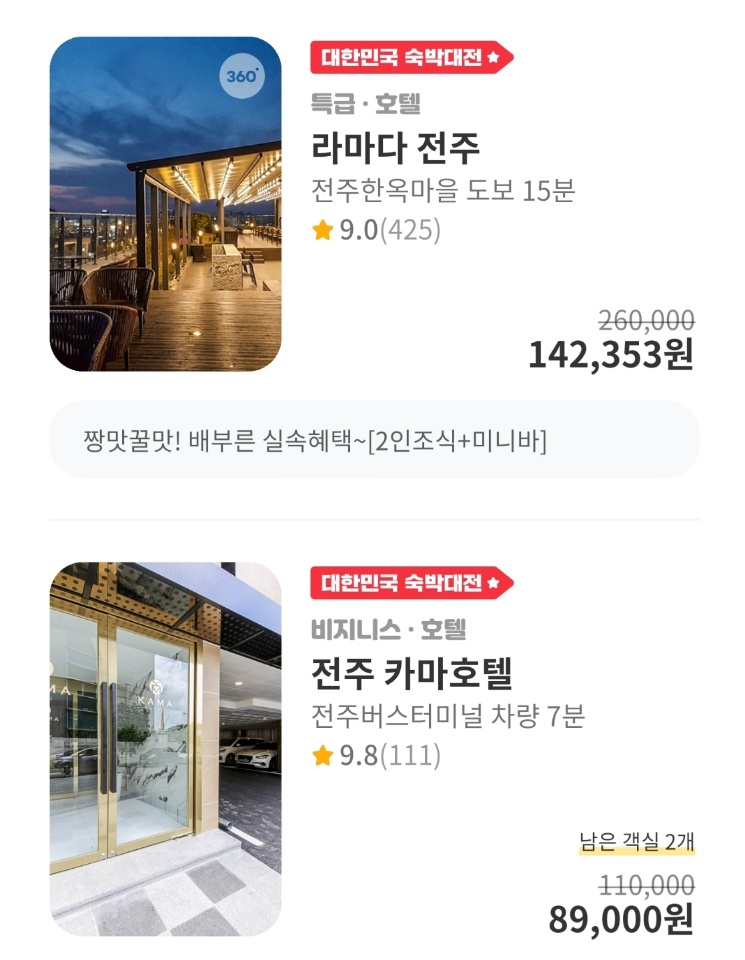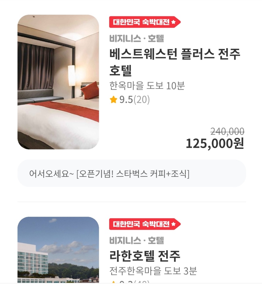 남편이 전주를 한번도 가보지 못했기 때문에 이번 여행지는 전주로 가닥을 잡았는데요, 호텔인걸 감안하면 가격이 그렇게 비싼 편은 아니라는 생각이 들었어요. 프라이빗 노천탕이 있는 숙소가 있을까 기대했는데, 전주 시내에 딱 한군데가 있었고 거긴 제가 원하는 날짜엔 이미 판매 완료가 되었더라구요.