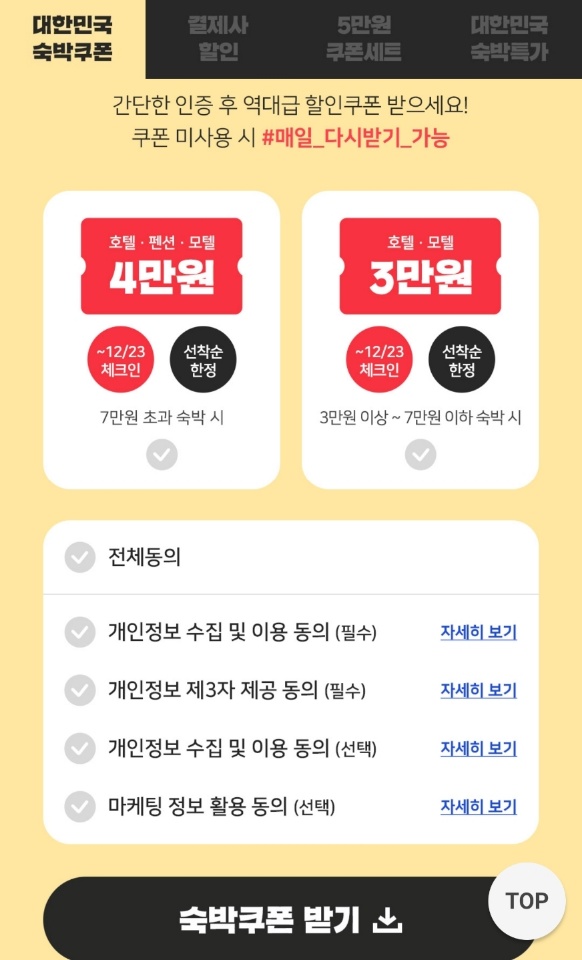 쿠폰 발급 사용처 이 숙박대전은 거의 대부분의 예약사이트에서 가능한것으로 보이는데요, 야놀자, 제주닷컴, 모두투어도 예약 할인이 됩니다. 주로 소셜 커머스 사용하시는 분들 위메프나 지마켓, 11번가 그리고 티몬까지도 이 예약할인이 가능하다고 하니 평소 이용하시던 분들에게는 너무 좋으실 것 같아요. 단, 호텔스컴바인 · 호텔스닷컴 · 아고다 등 호텔최저가 예약사이트는 해당사항이 아닙니다. 해외 업체라서 그런가요..? 저는 평소 잘 쓰는 여기어때 어플을 깔아두었기 때문에, 여기 업체를 이용해서 예매해보도록 하겠습니다.