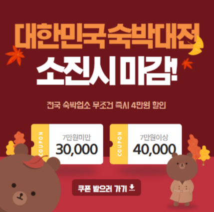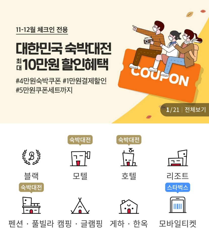 요즘 코로나로 인해 외출을 거의 안하는 상태죠. 소비심리가 이렇게 얼어붙어서야 해외는 커녕 국내 여행조차도 꿈꿀 수 없는 요즘. 국가적인 차원에서 관광 사업에 위기감을 느꼈는지 돈을 풀기 시작합니다. 바로 #대한민국_숙박대전 혜택입니다. 대한민국 숙박대전이란 관광진흥법, 공중위생관리법 등에 등록된 국내 숙박업소에 예약 · 결제를 하면 즉시 3만원에서 4만원, 최대 10만원까지 할인혜택을 받을 수 있게 하는 국가적 지원사업입니다. 모든 숙박업체는 아니지만, 어플에서 확인한 바로는 거의 대부분의 2성급 호텔은 이 혜택을 다 받을 수 있었어요. 대실 사용 불가하고, 캠핑시설 및 외국인 도시 민박법은 제외합니다.